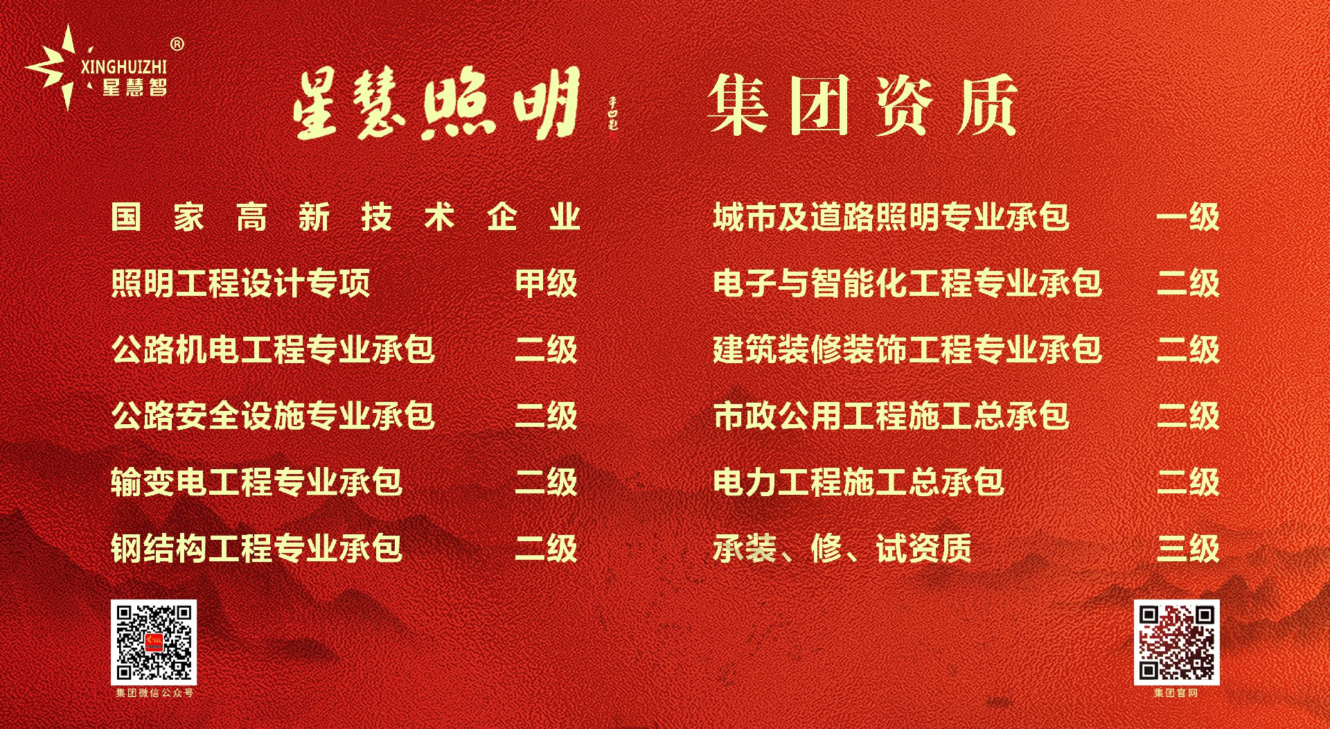 星慧照明工程集團(tuán)有限公司坐落在中國路燈制造基地:江蘇省高郵市送橋鎮(zhèn)工業(yè)集中區(qū)。公司成立于1999年,注冊資金5058萬元,廠區(qū)占地8萬多平方米,建筑面積6.5萬多平方米,主要下轄三大功能生產(chǎn)廠區(qū)和兩處商務(wù)運(yùn)營中心及集團(tuán)行政總部,是一家集科研、設(shè)計、生產(chǎn)、銷售、施工服務(wù)為一體的大型戶外照明產(chǎn)品制造商和集成運(yùn)營商。星慧照明工程集團(tuán)資質(zhì)實(shí)力雄厚,目前擁有“城市及道路照明專業(yè)承包一級資質(zhì)”、“照明工程設(shè)計專項甲級資質(zhì)”、“電子與智能化工程專業(yè)承包二級資質(zhì)”、“公路安全設(shè)施專業(yè)承包二級資質(zhì)”、“公路機(jī)電工程專業(yè)分項承包二級資質(zhì)”、“建筑裝修裝飾工程專業(yè)承包二級資質(zhì)”、“市政公用工程施工總承包二級資質(zhì)”、“鋼結(jié)構(gòu)工程專業(yè)承包二級資質(zhì)”、“電力工程施工總承包二級資質(zhì)”、“輸變電工程專業(yè)承包二級資質(zhì)”、“承裝(修、試)”三級資質(zhì)。公司榮幸被評為省重合同守信用企業(yè)、省質(zhì)量信得過企業(yè)、AAA級資信企業(yè),并成功通過ISO9001:2015質(zhì)量體系認(rèn)證、ISO14001:2015環(huán)境體系認(rèn)證、“CE”認(rèn)證及“CCC”及“CQC”國家強(qiáng)制性產(chǎn)品認(rèn)證、中國節(jié)能產(chǎn)品認(rèn)證。公司成立江蘇省研究生工作站,并先后榮獲江蘇省名牌產(chǎn)品、省著名商標(biāo)、高郵市市長質(zhì)量獎、揚(yáng)州市百強(qiáng)民營企業(yè)等榮譽(yù)證書,被江蘇省認(rèn)定為企業(yè)技術(shù)中心,并順利通過安全生產(chǎn)標(biāo)準(zhǔn)化二級企業(yè)驗(yàn)收并取得證書,為企業(yè)的跨越性發(fā)展打下健康穩(wěn)健的基礎(chǔ)!集團(tuán)公司的產(chǎn)品主要包括:智慧路燈、道